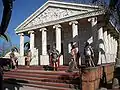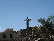 Tierra Santa is a large reproduction where visitors can walk the streets of Biblical Jerusalem, living step by step scenes from the life of Jesus as described in the Bible. Cultures represented include Christians, Jews, and Romans. A 18 metres (59 ft) Jesus rises from behind a rock every hour, on the hour,[2] a solemn religious experience for many visitors, but also provoking derision on the Internet as kitschy.[3] The park also includes statues of several 20th century historical figures such as Pope John Paul II and Mother Teresa, according to park staff were included because they were historic figures who "fought for peace" and that the park also wanted to also pay tribute to them.[3]