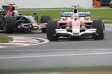 In the final race of the 2008 season, the Brazilian Grand Prix, Glock was seventh with a few laps to go when it started to rain. Glock remained on the track with dry-weather tyres, while most of the other drivers, including Lewis Hamilton, opted to pit for wet tyres.[6] The decision to stay out moved Glock up the order, ahead of Hamilton on track. Starting the final lap, Glock was fourth but was struggling on his dry-weather tyres as the rain intensified. He was passed by Toro Rosso's Sebastian Vettel and McLaren's Lewis Hamilton in the final corners. Hamilton regained fifth place to win the 2008 Drivers' Championship.[7] Glock finished the race in sixth and the championship in tenth position, with 25 points, behind teammate Jarno Trulli.[8]