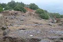 The hill has an elevation of 280 meters above sea level and overlooks the coastal plain of Sibari and the Gulf of Taranto. It is on the northern bank of the seasonal Raganello river. Close to the hilltop is the acropolis, which was the location of a sanctuary with three temples. The acropolis was surrounded by a defensive wall. Several terraces with evidence of settlement are located further downhill and the Macchiabate necropolis lies at the foot of the hill.[1] The ancient Greek city of Sybaris was located at a distance of 15 kilometers to the southeast.