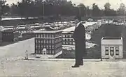 The miniature city project involved students from eighteen Springfield public high schools. The students, who were learning construction and handicraft, built the city of about 1,200 structures under the supervision of their teachers. It consisted of 1,000 miniature houses, in several neighborhoods, and 200 other structures. The miniature buildings and houses were built according to standard construction plans, and lumber and building-materials companies donated items for the project.[21] The buildings and homes were landscaped with real grass.[22] Their interiors were furnished and decorated like a full-sized house or building.[23] The buildings were scaled at one-half inch to the foot.[24] Tiny Town, with water mains and electric lights, was laid out on streets like a real city.[1]