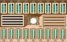 The game is played on a board with two rows of nine holes. There are two "kazna" between these rows, which are used to collect captured stones of each user, separately. At the beginning there are nine stones in each hole, except the kazna, which are empty, so players need a total of 162 stones.