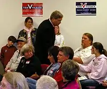 In mid-December 2006 Vilsack was interviewed by two major magazines. In U.S. News and World Report, he explained why he decided against forming an exploratory committee like many of his Democratic rivals, on the principle that he had "to get to work." He linked the issue of energy security to global warming and national security. He advocated moving American troops from southern and central Iraq to the north, and further commented that political reconciliation must be refocused on "building local governance" rather than spending "all the time on the national government."[4] In an interview with Rolling Stone, he made a distinction between "experience and judgment" and emphasized the importance of the latter. Vilsack attacked Republican candidate John McCain's planned Iraq troop surge as "making a big mistake bigger", and denied that the military had the resources to execute it. In discounting the importance of name recognition, he said "people don’t have to remember my name, they only have to remember the first letter which is V. It stands for vision, it stands for victory, it stands for Vilsack." He also expressed his satisfaction with frontrunner Hillary Clinton, calling himself "a big fan."[5]