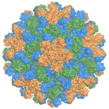 | The capsid of the tomato bushy stunt virus, with the three symmetrically distinct coat protein (p41) monomers colored in orange, green, and blue.[1] | |