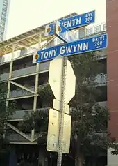 In 2007, a 9½-foot (2.9 m), 1,200-pound (540 kg) bronze statue of Gwynn was unveiled in the park just beyond Petco Park's outfield in an area named Tony Gwynn Plaza.[207][208][209] The address of Petco Park is 19 Tony Gwynn Drive.[207]