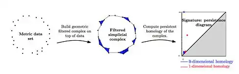 - If is a point cloud, replace with a nested family of simplicial complexes (such as the Čech or Vietoris-Rips complex). This process converts the point cloud into a filtration of simplicial complexes. Taking the homology of each complex in this filtration gives a persistence module