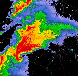 ![]() The Raleigh supercell as it is about to enter the city. The upside down triangle icon is a tornado vortex signature marker. | |