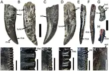 In 2000, material from Portugal was referred to a Torvosaurus sp. by Octávio Mateus and Miguel Telles Antunes.[10] In 2006 fossils from the Portuguese Lourinhã Formation were referred to Torvosaurus tanneri.[11] In 2012, however, Matthew Carrano e.a. concluded that this material could not be more precisely determined than a Torvosaurus sp.[7] In 2013 eggs and embryos were reported from Portugal, referred to Torvosaurus.[12] The species from Portugal was named T. gurneyi in honor of James Gurney in 2014, the creator of the Dinotopia series of books. It is the largest theropod known from Europe.[1] It was the morphological distinctiveness of the holotype maxilla ML1100 that led to the naming of the Portuguese species.[1]