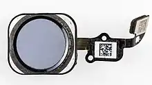 Touch ID is built into the home button, which is built of laser-cut[10] sapphire crystal, and does not scratch easily (scratching would prevent Touch ID from working).[11] It features a stainless steel detection ring to detect the user's finger without pressing it. There is no longer a rounded square icon in the home button, nor is it concave.