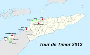 The race began at the presidential palace in Dili and visited Baucau, Loi-Huno, Betano and Maubisse, ending in Dili.[2]