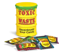 Toxic Waste is a line of sour candies owned and marketed by American company Candy Dynamics Inc., which is headquartered in Indianapolis, Indiana.[1][2] The products are sold primarily in the United States and Canada as well as several international markets such as the United Kingdom, South Africa and Ireland.[3] The toxic waste candy is packed in novelty drum containers, each holding 16 pieces of sour candy which come in five different flavors.
