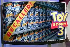 The film's first teaser trailer was released with Up in Disney Digital 3-D on May 29, 2009.[38] On October 2, 2009, Toy Story and Toy Story 2 were re-released as a double feature in Disney Digital 3-D.[39] The first full-length trailer was attached as an exclusive sneak peek and a first footage to the Toy Story double feature on October 12, 2009.[40] A second teaser was released on February 10, 2010, followed by a second full-length trailer on February 11, and appeared in 3D showings of Alice in Wonderland and How to Train Your Dragon.[41] On March 23, 2010, Toy Story and Toy Story 2 were released separately on Blu-ray/DVD combo packs; Toy Story included a small feature of "The Story of Toy Story 3" and Toy Story 2 included one on the "Characters of Toy Story 3."[42][43]