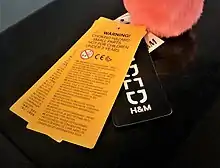 Manufacturers often display information about the intended age of the children who will play with the toy. In the U.S. this label is sometimes mandated by the CPSC, especially for toys which may present a choking hazard for children under three years of age. In most countries the intended age is either shown as a minimum age or as an age range. While one reason for this is the complexity of the toy and how much it will interest or challenge children of different ages, another is to highlight that it may be unsafe for younger children. While a toy might be suitable for children of one age, and thus this is the age recommended on the product, there may be safety hazards associated with use by a lower age group, necessitating a mandatory warning. Some manufacturers also explain the specific dangers next to the advised age (as is mandated by European and International toy safety standards EN71 and ISO 8124 respectively, but not US standard ASTM F963).[15] Some accidents occur when babies play with toys intended for older children.[1]