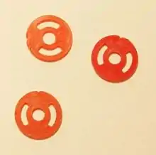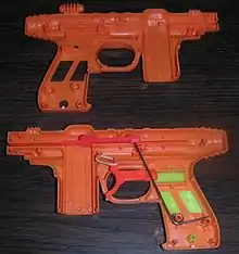 A tracer gun, sometimes known as a disc gun, is a kind of toy gun made of durable plastic. The toy shoots lightweight plastic discs roughly the size of a penny. Kids discovered it would also shoot U.S. pennies over a shorter distance. The discs used as ammunition for these guns are often sold with the label "Jet Discs." The firing mechanism is a spring, The magazine holds 20 "discs." Range is about 30 feet, and even then, accuracy is far from dependable. The trigger requires some force. The firing sound is a loud, low, and distinctive "snap!". Oftentimes the trigger will become loose and will take multiple attempts to shoot.