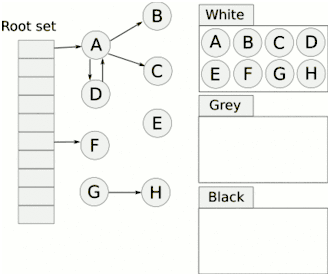 - Move each white object it references to the gray set. This ensures that neither this object nor any object it references can be garbage-collected.