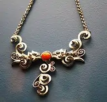 Initially, the working of metals in the new colony was heavily restricted or outright banned for several reasons, including protection of Spanish metal guilds, the fact that the work did not contribute to royal taxes and the fear that the indigenous would make weapons.[5][12][13] However, these soon became impractical to enforce with the restrictions then only to the making of objects related to indigenous religion.[14] The Spanish introduced new metalworking techniques, especially the promoting of copper work by Vasco de Quiroga in Michoacan and various metals by Pedro de Gante in Mexico City .[1][5][12] and eventually indigenous craftsmen competed with European ones.[14] Most of Mexican colonial metal work copied that in Spain, which was Gothic in style and later Renaissance. These styles eventually defined the handcraft work of areas such as Oaxaca, Zacatecas, Durango, San Luis Potosí and Guanajuato .[15] However, after the Conquest, the making of jewelry in Mexico nearly disappeared, with precious metals shipped to Spain. Only after 1551, with the establishment of a Mexican upper class, did this return slowly. At first Spanish craftsmen arrived to work European methods including filigree, repoussé and chasing, engraving and the incrustation of precious stones. But during the colonial period, these craftsmen never reached the level of their contemporaries in Europe. Indigenous craftsmen were relegated in this area to producing cheaper jewelry with lesser metals.[16]
