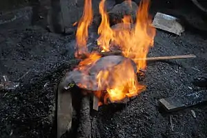 While copper was worked in some parts of Mesoamerica, modern Mexican tradition is Spanish in origin.[29] Copper working was initially ignored by the Spanish conquistadors as they were looking for gold and silver. It was not shipped to Spain as much as the other two. Instead, it eventually became important for the creation of utilitarian items, especially domestic items such as pots and pans.[15] Today, the center of traditional copper work in Mexico is the state of Michoacán, especially the municipality of Santa Clara del Cobre. One traditional hammered copper object is a large vessel in which pork fat is rendered or sugar caramelized for making candies. Every year during the month of August Santa Clara del Cobre holds a copper festival.[30]