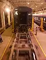 Wheels rolling below an elevated carriage during the wheel changing from Mongolian to Chinese gauge