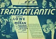 Transatlantic is a 1931 American pre-Code comedy film directed by William K. Howard and starring Edmund Lowe. It won an Academy Award for Best Art Direction by Gordon Wiles.[1][2]