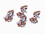 Transferrin also has a transferrin iron-bound receptor; it is a disulfide-linked homodimer.[16] In humans, each monomer consists of 760 amino acids. It enables ligand bonding to the transferrin, as each monomer can bind to one or two atoms of iron. Each monomer consists of three domains: the protease, the helical, and the apical domains. The shape of a transferrin receptor resembles a butterfly based on the intersection of three clearly shaped domains.[17] Two main transferrin receptors found in humans denoted as transferrin receptor 1 (TfR1) and transferrin receptor 2 (TfR2). Although both are similar in structure, TfR1 can only bind specifically to human TF where TfR2 also has the capability to interact with bovine TF.[8]