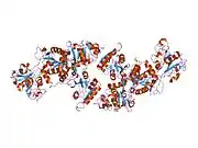 Transferrins are glycoproteins found in vertebrates which bind to and consequently mediate the transport of Iron (Fe) through blood plasma.[5] They are produced in the liver and contains binding sites for two Fe3+ atoms.[6] Human transferrin is encoded by the TF gene and produced as a 76 kDa glycoprotein.[7][8]