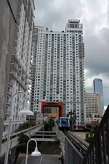 Therefore, the Miami metropolitan area remains highly automobile dependent, with a prominent grid system made up of many wide, dangerous roads[62] interlaced with various highways, most of which have tolls. Office buildings and other high-rises and semi dense communities are spread sparsely throughout the area, with a lowly defined central business district and no defined edge cities, leading to many long commutes in all directions.[10] The lack of density and transit-oriented development also helped lead to the downfall of the Metrorail Orange Line North Corridor along NW 27 Avenue.[63] Many of the buildings in downtown Miami sit atop large parking pedestals, often over 10 stories high, or have a separate, proprietary parking garage on site, such as the 14-story Southeast Financial Center parking annex. Other than the Government Center transit hub and the Miami Tower, both built in the 1980s in conjunction with the system, no buildings were built with a direct connection to the Metromover until Brickell City Centre in 2015. Despite this, nearly all the condos built in the 2000s and 2010s real estate boom were in the downtown area along the Metromover lines, leading to a doubling in ridership from 2000 to 2011, with daily average ridership now at over 30,000.[64]