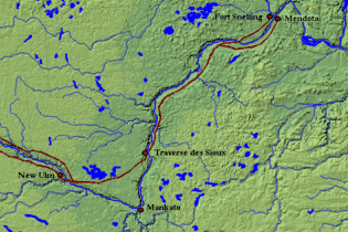By the 1840s it was used as a transshipment point in the fur trade. Pelts from upstream fur posts and from collection points as far away as Pembina and Fort Garry, Canada, were brought by ox cart trains traveling on the West Plains Trail, the westernmost of the Red River Trails. At Traverse des Sioux, the furs were transferred to flatboats bound for Mendota, Minnesota and eastern markets. In the later part of that period, some cart trains traveled all the way to Mendota or Saint Paul, Minnesota, whence the furs were taken by Mississippi riverboat to markets downriver.[13] By 1851 the settlement had two missionaries and their families, a school, several fur trading establishments, a few cabins of French voyageurs, and twenty to thirty Indian lodges.[11]