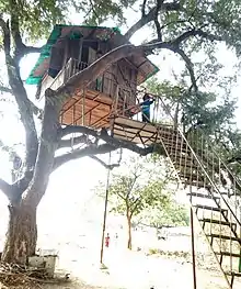 A tree house, tree fort or treeshed is a platform or building constructed around, next to or among the trunk or branches of one or more mature trees while above ground level. Tree houses can be used for recreation, work space, habitation, a hangout space and observation.