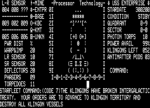 Trek-80 was a basic language, 16K program written by Bruce Berry, and was the first computer game produced by a science-fiction/fantasy wargaming company. Barry took many ideas from the numerous Trek programs already on the market, and added a few new and different twists.[1]