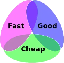 Arthur C. Clarke cited a management trilemma encountered when trying to achieve production quickly and cheaply while maintaining high quality.[16] In the software industry, this means that one can pick any two of: fastest time to market, highest software quality (fewest defects), and lowest cost (headcount). This is the basis of the popular project management aphorism "Quick, Cheap, Good: Pick two," conceptualized as the project management triangle or "quality, cost, delivery".