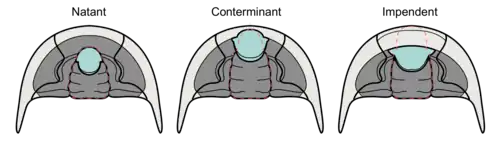 Principal evolutionary trends from primitive morphologies, such as exemplified by Eoredlichia,[25] include the origin of new types of eyes, improvement of enrollment and articulation mechanisms, increased size of pygidium (micropygy to isopygy), and development of extreme spinosity in certain groups.[17] Changes also included narrowing of the thorax and increasing or decreasing numbers of thoracic segments.[25] Specific changes to the cephalon are also noted; variable glabella size and shape, position of eyes and facial sutures, and hypostome specialization.[25] Several morphologies appeared independently within different major taxa (e.g. eye reduction or miniaturization).[25]