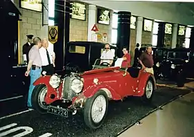 The first use of the "Dolomite" name was in 1934, when it was used for an eight-cylinder sports car which resembled the Alfa Romeo 8C.[2] However this car did not make production, with only three being made. The engine was of 1,990 cc capacity with twin overhead camshafts and fitted with a Roots-type supercharger.[2] The engine output was 140 bhp (100 kW) at 5,500 rpm,[3] giving the car a top speed of over 110 mph (180 km/h) when tested at Brooklands.[4] Lockheed hydraulic brakes with large 16 in (410 mm) elektron drums were fitted.[4][5] The channel-section pressed steel chassis was conventional with a beam front axle and half-elliptic springs all round.[4]