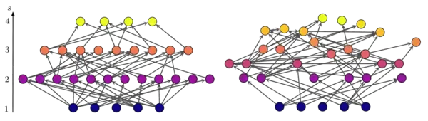 The figure shows two networks which differ in their trophic coherence. The position of the nodes on the vertical axis corresponds to their trophic level. In the network on the left, nodes fall into distinct (integer) trophic levels, so the network is maximally coherent . In the one on the right, many of the nodes have fractional trophic levels, and the network is more incoherent .[6]