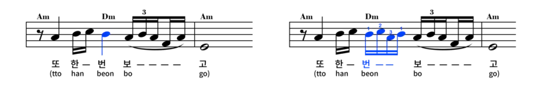 - The 'Kkeokk-ki' technique may be better explained by the gruppetto ornament of the classical music theory. A note is figured, as if it had been split into two or four subsidiary notes. And the voice is inflected to these imaginary notes: e.g. one quarter note is split into four sixteenth notes: (1) one in original pitch - (2) one in upper pitch - (3) one in lower pitch - (1) one in original pitch again (see below image, the example measure is from Na Hun-a's "Turning Waterwell"). Kkeokk-ki happens in the transition between two notes in original pitch. For the ordinary listeners, it is not easy to quickly perceive the subtlety of this technique. However, any Trot singer can hardly do without the elaborated effect of Kkeokk-ki.