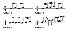 Trot is known for being composed in a two-beat rhythm, also known as duple metre. In its early days, Trot music was often composed using the pentatonic scale and minor keys. This pattern is called anhemitonic scale or anhemitonic pentatonic scale, which was characteristic in early Japanese enka and other folk music such as Korean 'Gyeonggi-minyo'.[7] The pentatonic scale consists of five degrees: of the natural major scale, the 4th and 7th degree are omitted, and to form the pentatonic minor scale, all these 5 degrees will descend 3 degrees. Before 1950, the pentatonic minor scale dominated in popularity, however, the pentatonic major scale has started to become more popular.[8] After the Japanese occupation, Trot music was composed using the heptatonic scale and major keys. In trot music, lower tones are generally sung with vibrato, while higher tones are sung with the flexing or turning technique called 'kkeokk-ki' (literally means flexing, Korean: 꺾기).