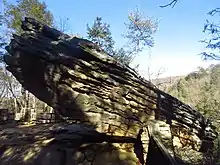 Balanced Rock and Copperas Rocks are two examples of the effects of erosion that can be seen by visitors to Trough Creek State Park. Balanced Rock is perched atop a cliff alongside Great Trough Creek. It appears as if it could tumble into the creek below with the slightest push, but it has held the same position for thousands of years.[7] Balanced Rock is made up of a hard type of rock that did not erode like the rock surrounding it. As the mountains eroded away Balanced Rock remained.[7]
