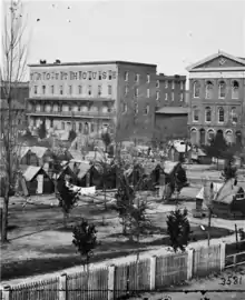 Trout House visible at back of this photo of State Square during Civil War, when the square was the site of a "tent hospital"