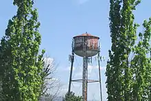 The community was once known as Sandy, after the nearby Sandy River; the post office in Sandy was established in 1854 and closed in 1868.[7] In 1873, the current city of Sandy in Clackamas County, which was formerly named "Revenue", established a different Sandy post office that is still in operation.[7] Troutdale was named by pioneer John Harlow for the trout pond in a dale near his house.[7] Troutdale post office was founded in 1880.[7] In 1925, a company, the Bissinger Wool Pullery, was moved from Sellwood, Oregon, and opened for business on Macadam Road along the west bank of the Sandy River. [8][9] An iconic water tower stands nearby. The company was featured in a Ripley's Believe it or Not! column because a cat was reportedly found in a stack of animal hides that the company was going to use for its products. The cat was taken care of and became the company's mascot, and was said to have lived a long and healthy life.[10] The water tower is now known as the "Old Historic Water Tower".
