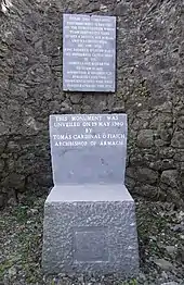 The High Cross of Tuam was erected in 1152 possibly to commemorate the appointment of the first Archbishop of Tuam, Archbishop Áed Ua hOissín. An inscription at the base calls for "A prayer for O'hOisín; for the Abbot; by whom it was made". It is reputed to have been the tallest of the High Crosses of Ireland, but its artistry is scarred by the absence of the top portion of the main shaft.[14] The sandstone Cross was originally erected in proximity to the earliest Cathedral erected in the town, a part of which still remains and is incorporated into St Mary's Cathedral (12th-century red sandstone chancel arch in Irish Romanesque architecture, which is a National monument). The original High Cross or Market cross may have been erected close to what is now the Market Square and High Street.