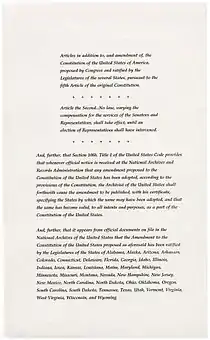 - "Certification of Twenty-seventh Amendment" (PDF). Federal Register. National Archives and Records Administration. 57 (97): 21187. May 19, 1992. Retrieved December 16, 2018.