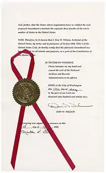 On May 19, 1992, the Twenty-seventh Amendment's certificate of ratification, signed by the Archivist of the United States, Don W. Wilson, on May 18, 1992, was printed and published in the Federal Register.[29]