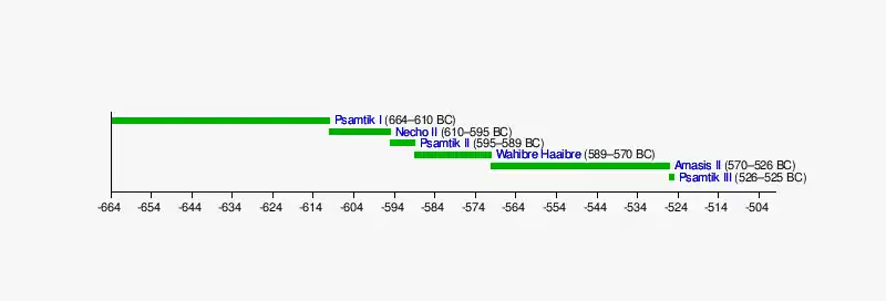 ![]() | 664–610 BC | Wahibre | Sais | Mehytenweskhet | Reunified Egypt and ended the Nubian control of Upper Egypt. Manetho gives his reign as 54 years. |