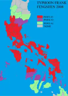 From June 20 to June 23, in response to Typhoon Fengshen (Frank) threatening the Philippines, PAGASA at various times issued Public Storm Warning Signal #3 for various parts of Luzon and Visayas as well as Storm Warning Signals 1 & 2 for some parts of Mindanao (specially around the Surigao area).[10] Gradually over the next few days these storm warnings were scaled back as Typhoon Fengshen (Frank) moved through the country.