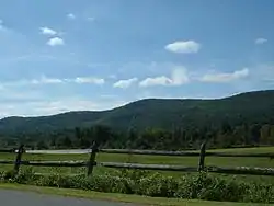 Tyringham is located in the Hop Brook Valley in the Berkshire Hills. To the northeast of the valley, Baldy Mountain rises to a large plateau which stretches into the neighboring towns, and includes Goose Pond. To the southwest of the valley, two mountain peaks - Mount Wilcot and Hunger Mountain - rise in a plateau in neighboring Monterey. The Appalachian Trail passes through the town, winding down Sky Hill (a part of Mount Wilcot), then sweeps through the valley and over Baldy Mountain and towards Becket Mountain.
