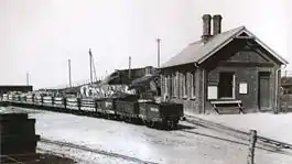 The earliest recorded passenger train from Wharf was in 1877, though there is circumstantial evidence of them even earlier than that.[2] Around 1910, the station was renamed Towyn Wharf, although the name of "King's station" continued to be used for formal occasions until at least 1915.[2] The station had no run-round loop at the time;[1] shunting was carried out by propelling trains up the gradient out of the station and allowing them to run in under gravity.[3] A siding was provided in the cutting just to the east of the station, to aid this gravity working.[3] Passenger trains were propelled to the loop at Pendre, where they were run-around.[1] It was only after the line had been preserved in 1951 that a loop was finally provided, in the winter of 1951-1952.[1]