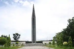 The radio station was built on land which before World War II been a part of Camp O'Donnell a U.S. Military reservation used as a bombing and artillery range. At the onset of World War II, the Philippine Armed Forces were brought under the jurisdiction of the U.S. Armed Forces, and the eastern portion of Camp O'Donnell was designated as a Philippine Army camp.[1] After the surrender of the U.S. and Philippine forces at Bataan in early 1942, the army camp became an impromptu Japanese prisoner of war camp, and, in April 1942, was the final destination of the infamous Bataan Death March.[2] From April 1942 until June 1942, approximately 9,000 U.S. military personnel, and 50,000 Filipino soldiers were interned there;[3] during that time, over 1,500 of the Americans and 20,000 of the Filipinos died at the camp.[4][5] Eventually, the death toll would climb to 1,565 Americans and 26,000 Filipinos.[6][7] The cause of the deaths ranged from malnutrition, dysentery, malaria, lack of medical care, and execution.[8] The Japanese Army segregated the Americans on the north side of the camp, and Filipinos on the south side. A large concrete cross monument marked the site of a cemetery for the Americans who died there, and a similar monument marked the Filipino graves. The American cemetery memorial marker has since been relocated to the P.O.W. museum at Andersonville, Georgia. Beginning in 1945, the remains of the fallen American prisoners were reinterred at Fort William McKinley, near Manila, or, at the request of next of kin, in cemeteries in the United States.[9]