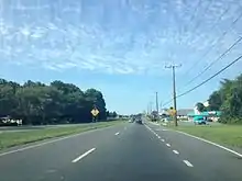 US 113 serves as an important route carrying local and through traffic along with tourist traffic bound for the Delaware Beaches and Ocean City, Maryland to the east; as such the highway experiences congestion in the summer months when tourism to the beach areas is at its highest.[5][6] Access from US 113 to the beach areas is provided by US 9 and DE 404 toward Lewes, Rehoboth Beach, and Dewey Beach; DE 26 toward Bethany Beach; DE 54 toward Fenwick Island; MD 90 toward northern Ocean City; US 50 toward downtown Ocean City; and MD 376 toward Assateague Island.[7] US 113 also serves as a part of a primary hurricane evacuation route from the beach communities to inland areas to the north.[8] In 2016, US 113 had an annual average daily traffic count ranging from a high of 38,505 vehicles at the US 9 intersection in Georgetown to a low of 6,070 vehicles between the southern terminus of US 113 Business and MD 12 in Snow Hill.[1][2] All of US 113 is part of the National Highway System, a network of roads important to the country's economy, defense, and mobility.[9][10]