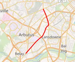 | Baltimore | Arbutus | 0.00 | 0.00 | Southern terminus; northbound exit from and southbound entrance to US 1 | |