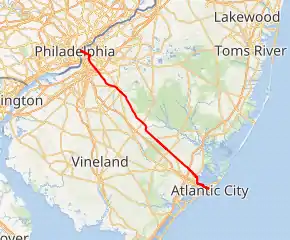 U.S. Route 30 (US 30) is a U.S. highway running from Astoria, Oregon east to Atlantic City, New Jersey. In the U.S. state of New Jersey, US 30 runs 58.26 miles (93.76 km) from the Benjamin Franklin Bridge at the Delaware River in Camden, Camden County while concurrent with Interstate 676 (I-676) southeast to Virginia Avenue in Atlantic City, Atlantic County. Most of the route in New Jersey is known as the White Horse Pike and is four lanes wide. The road runs through mostly developed areas in Camden County, with surroundings becoming more rural as the road approaches Atlantic County. US 30 runs through several towns including Collingswood, Berlin, Hammonton, Egg Harbor City, and Absecon.