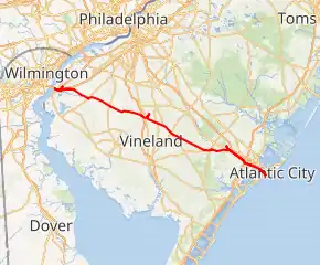 U.S. Route 40 (US 40) is a U.S. highway running from Park City, Utah east to Atlantic City, New Jersey. The easternmost segment of the route runs 64.32 miles (103.51 km) through the southern part of New Jersey between the Delaware Memorial Bridge over the Delaware River in Pennsville Township, Salem County, where it continues into Delaware along with Interstate 295 (I-295), east to Atlantic Avenue and Pacific Avenue in Atlantic City, Atlantic County. The route passes through Salem, Gloucester, and Atlantic counties as well as the boroughs of Woodstown, Elmer, Newfield, and Buena. The route encounters a mix of rural, suburban, and urban environs throughout its journey across South Jersey.