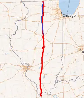 U.S. Route 51 (US 51) in the U.S. state of Illinois, is a main north–south artery that runs from the Ohio River north to the Wisconsin border, a distance of 415.95 miles (669.41 km).[1]